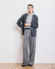 Women's wide-leg pants in plain wool flannel, high waist. Flat waistband with belt loop, zipper closure with button at waist. Italian side pockets and buttoned back welt pockets.