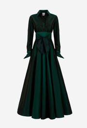 Mariasole long green long floor-length long sleeve circle skirt shirt dress with double cuffs in poly techno taffeta, colour iridescent forest green. Hidden front button closure with mother-of-pearl buttons and cuffs embellished with crystal jewel cufflinks. Belt in same fabric.