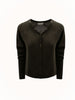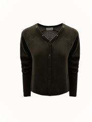 A high v neck style cardigan extra buttons at the neckline, diagonal shoulder seams  finishing off with split cuffs.