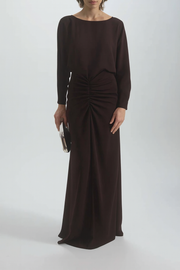 Technical crepe dolman sleeve gown with center gather skirt detail.