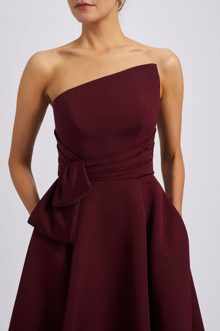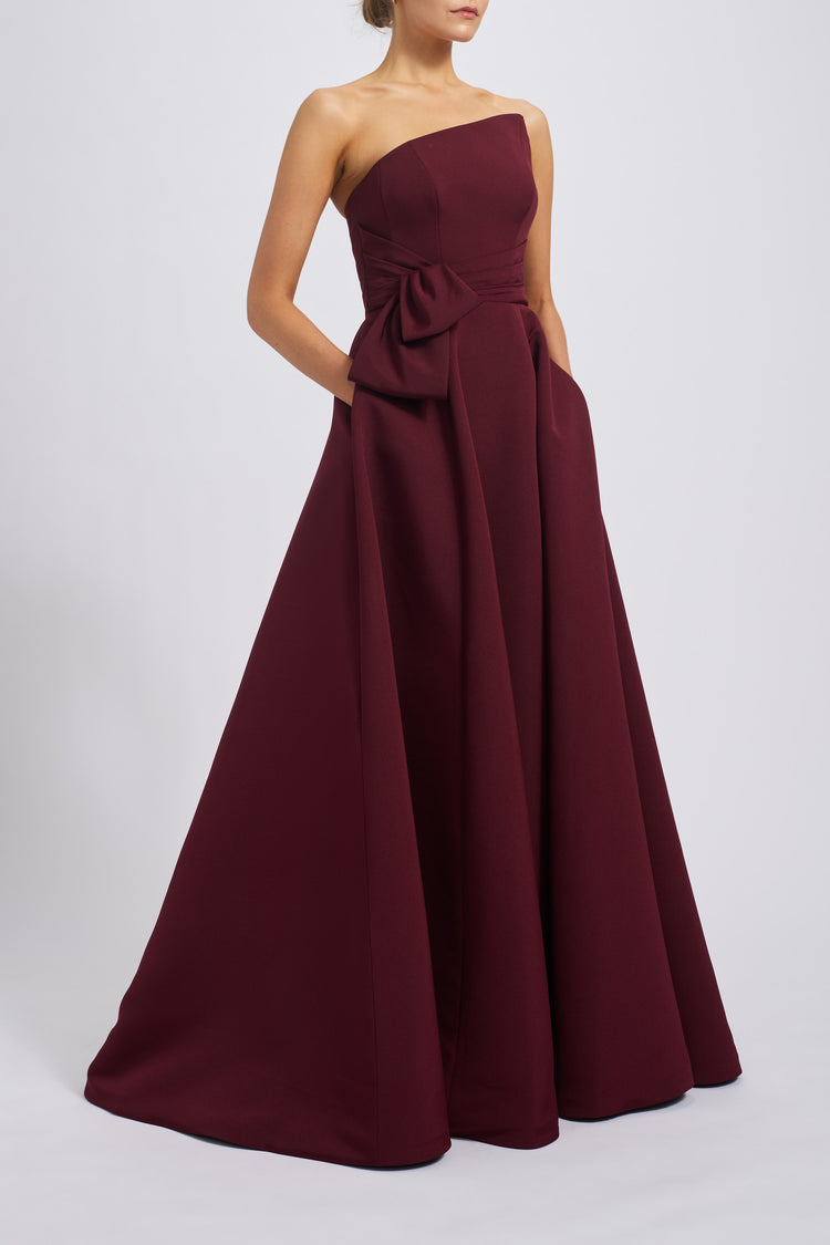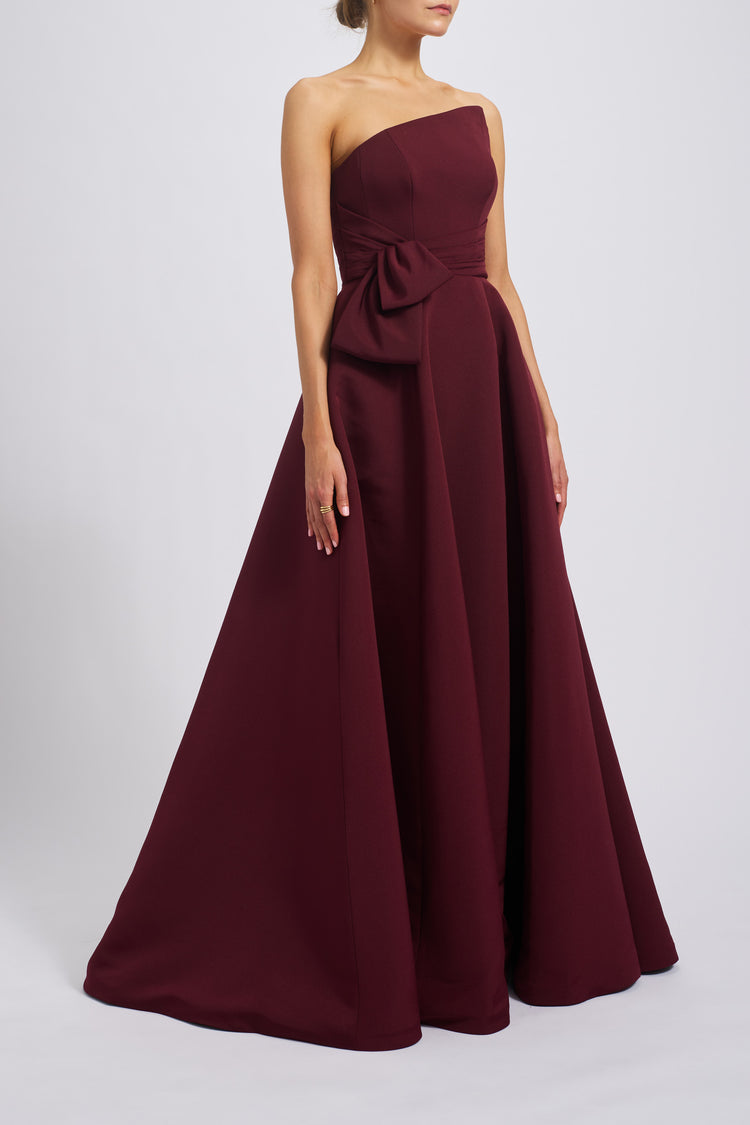 AMSALE FAILLE GOWN WITH ASYMMETRIC BODICE IN RUBY