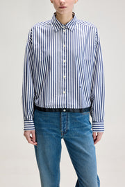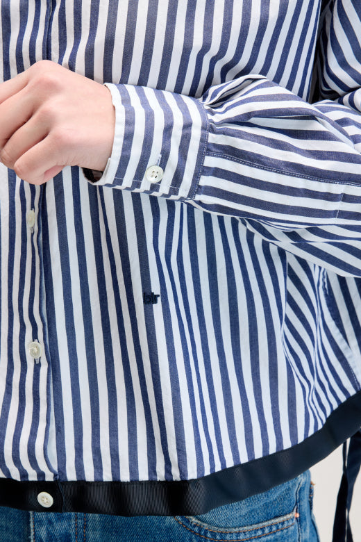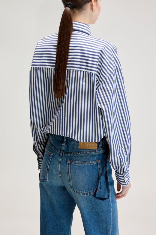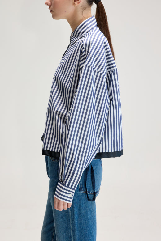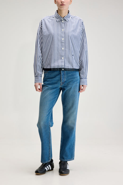 A cropped shirt with long sleeves in a blue stripe with a classic collar, button front, and a contrasting wide hem in navy.