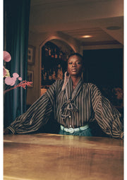 Long sleeve loose blouse with stripe design throughout and featuring a large bow tie.