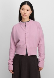 This extra-fitted cashmere crewneck cardigan with batwing sleeves and 7 buttons is designed for a comfortable and flattering fit that is perfect to combine with high-waisted bottoms as it’s slightly cropped. The rib knitted neck, cuffs, and hem add a touch of texture and ensure a snug yet flexible feel and there’s a seam in the back. the buttons are made of highly durable corozo, a completely natural, chemical-free material derived from the seed of a palm tree