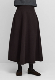 the ease is a flared cashmere midi skirt with a comfortable rib-knitted waistline and a rolling edge hem. crafted from high-quality cashmere, this skirt is warm and voluminous, perfect for any occasion.