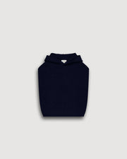 Sleeveless women's rib-knit sweater with hood. Drop armholes. Ribbing on shoulders.