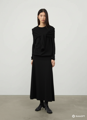 The Othelia sweater is crafted in mid-weight cashmere with an intricate construction. The relaxed fit, hip-length silhouette features a round neck and ribbed trims throughout. The sleeves are suspended from the nape and can be styled in various ways – wrapped around the neck or draped loosely down the arms
