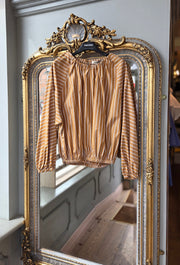 Camel coloured top with white pinstripes. Features elasticated waist and cuffs and gathered round neckline.