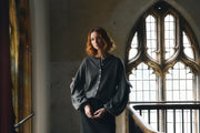 Dropped shoulders lead to a balloon sleeve which cinches back in at the wrist. Inspired by the cascading layers of 1800s Victorian mourning dresses, the softest pure silk tulle is gathered with a band of velvet at the top of the bulbous sleeve adding a whisper of hazy texture and movement.